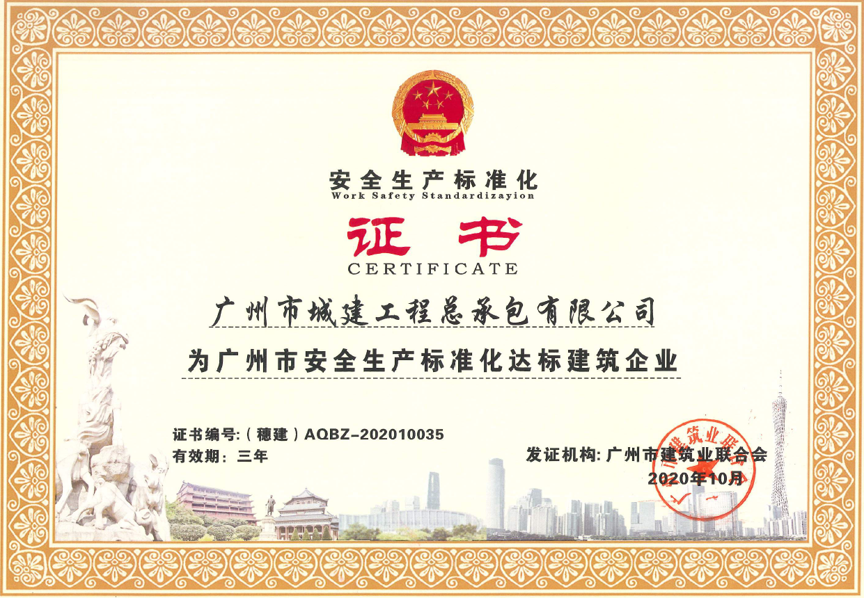 公司經過開展企業(yè)自評和專家到企業(yè)、施工現(xiàn)場進行復評等兩個階段的評定,順利通過安全生產標準化的達標認證工作,獲得廣州市安全生產標準化達標建筑企業(yè)證書。