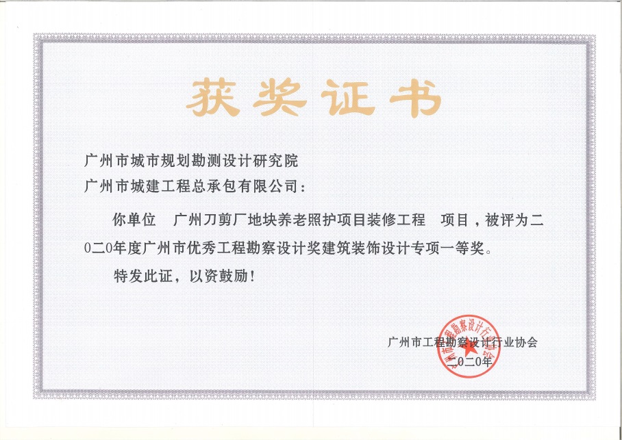 公司廣州刀剪廠地塊養老照護項目裝修分部分項工程在廣州市2020年度優秀工程勘察設計獎評選中獲建筑裝飾設計專項一等獎。主要設計人員包括:江永耀、袁學松、錢萍、陳麗牡、陳建拓、崔衛琪、盧穎欣、朱鳳樁。