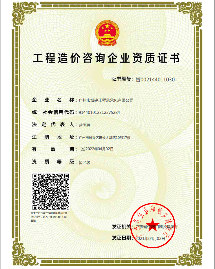 經過公司積極籌備,不斷完善材料,公司工程造價咨詢暫乙級資質申請順利通過廣州市住房和城鄉建設局審批,并于2021年4月2日取得資質證書。此次暫乙級資質的獲得,為公司進一步開拓工程造價咨詢市場奠定了基礎,使公司的業務范圍得到延伸。公司將更加努力拓寬業務渠道,不斷提高工程管理服務水平,同時為局和院的概預算工作提供更全面、更專業的服務和保障。