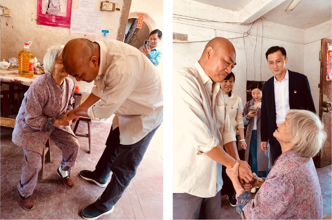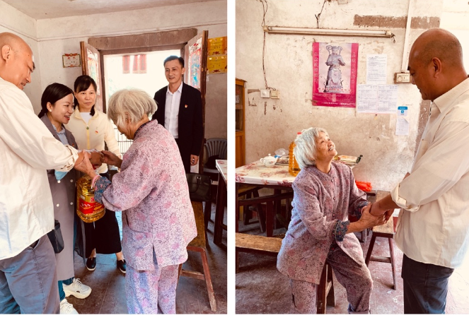 萬錦英老人家中有三口人,其 53歲的兒子在外打工的同時要照顧視力一級殘疾的孫子,所以老人在黎塘村老屋的家中常常是一個人居住,平時飲食起居全靠老人自己。蔡慶立同志駐村后經常關心老人的身體生活狀況,噓寒問暖,甚至為老人量腳上網購買合適的鞋;老人屋后出入的木橋破舊,存在安全隱患,駐村工作隊為老人籌資修建了結實的鐵板橋和護欄。老人拉著前來探望她的陳蓉書記,眼含熱淚,對幫扶單位和駐村工作隊一再表示感謝。老人腰腿不好,我們離開時鎖好她家后門不讓她送,她堅持走出二樓門外,站在新修的鐵橋邊,依依不舍目送我們離開……
